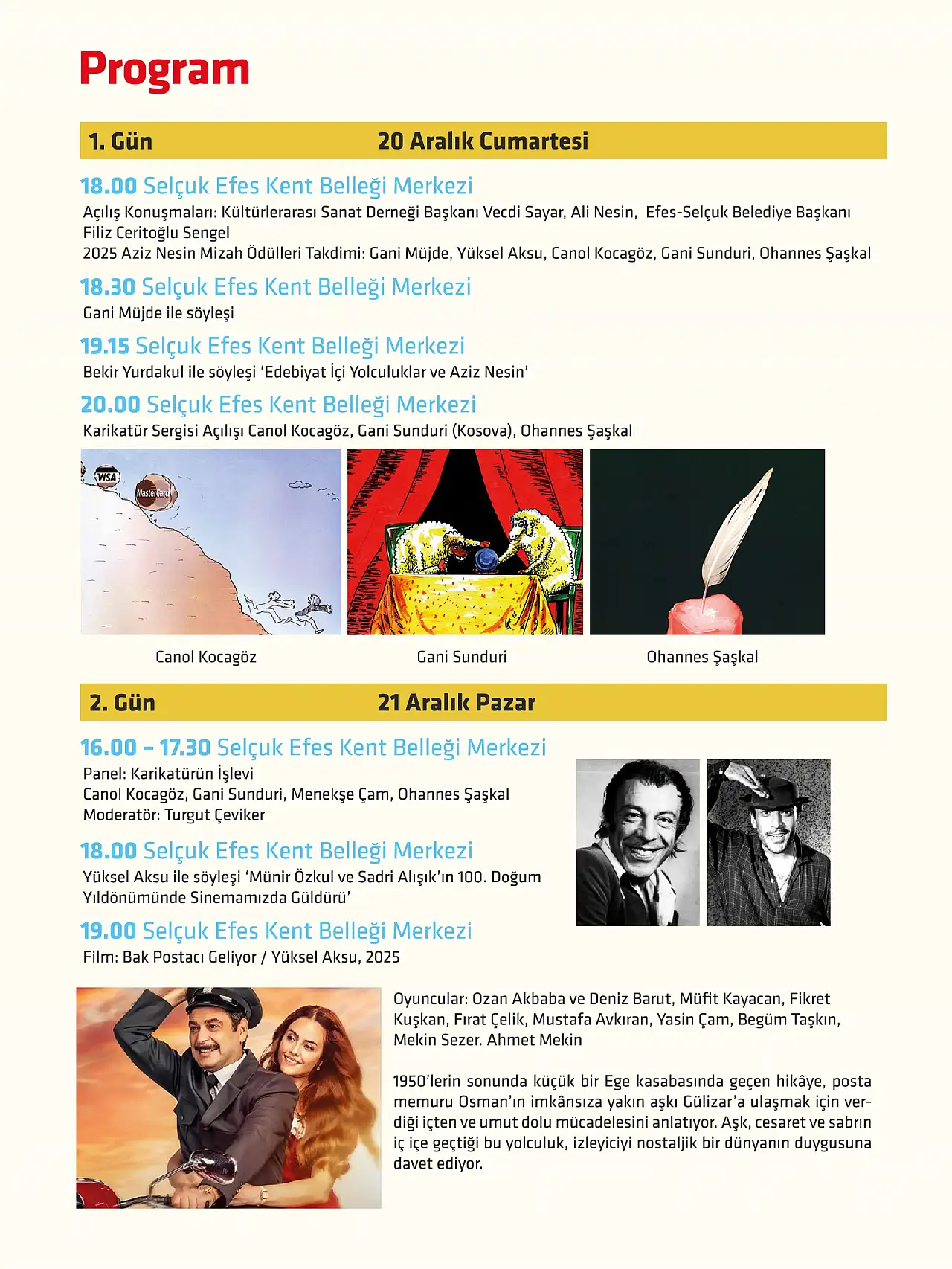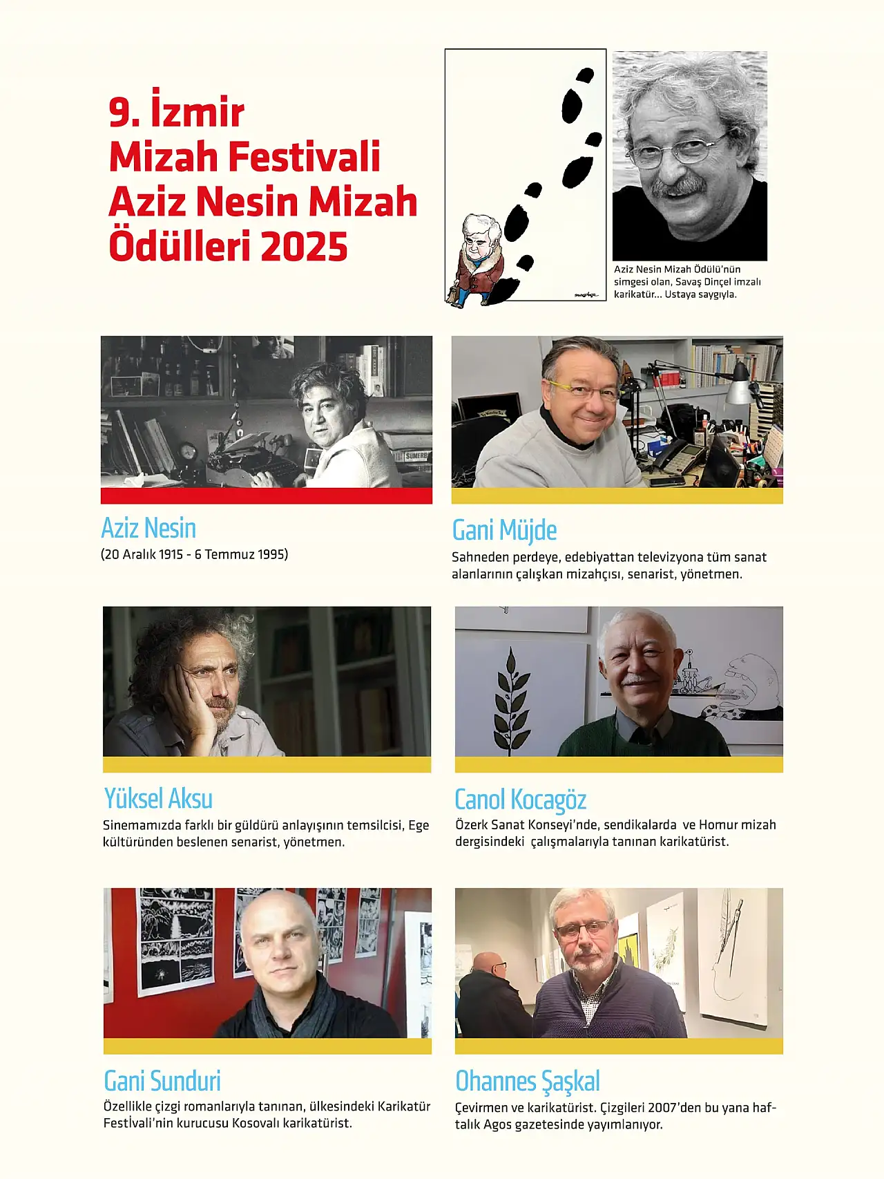 Açılış programının ardından, mizah ve sanat dünyasının usta isimleri Gani Müjde, Yüksel Aksu, Canol Kocagöz, Gani Sunduri ve Ohannes Şaşkal’a 2025 Aziz Nesin Mizah Ödülleri takdim edilecek.