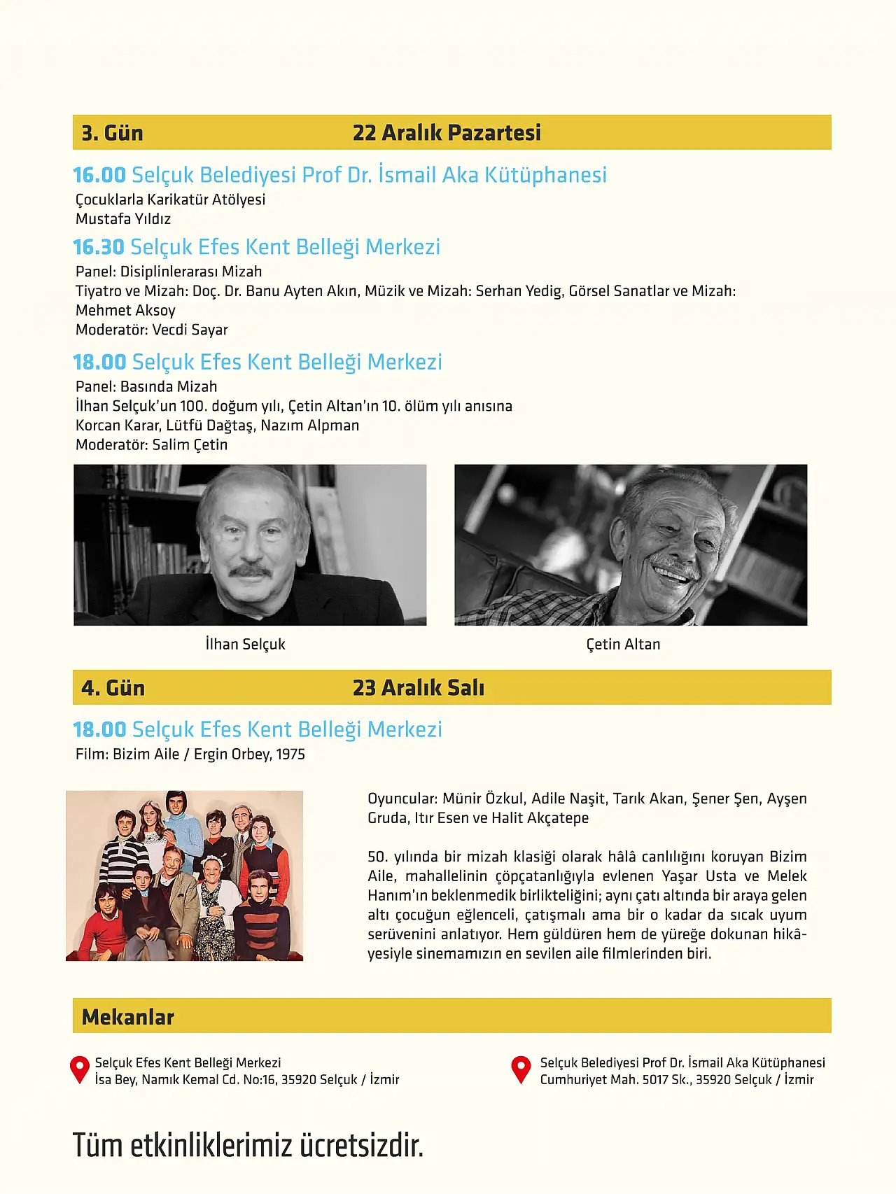 İzmir Uluslararası Mizah Festivali, 23 Aralık Salı günü Selçuk Efes Kent Belleği’nde Yeşilçam’ın unutulmaz filmlerinden **“Bizim Aile”**nin gösterimiyle sona erecek.