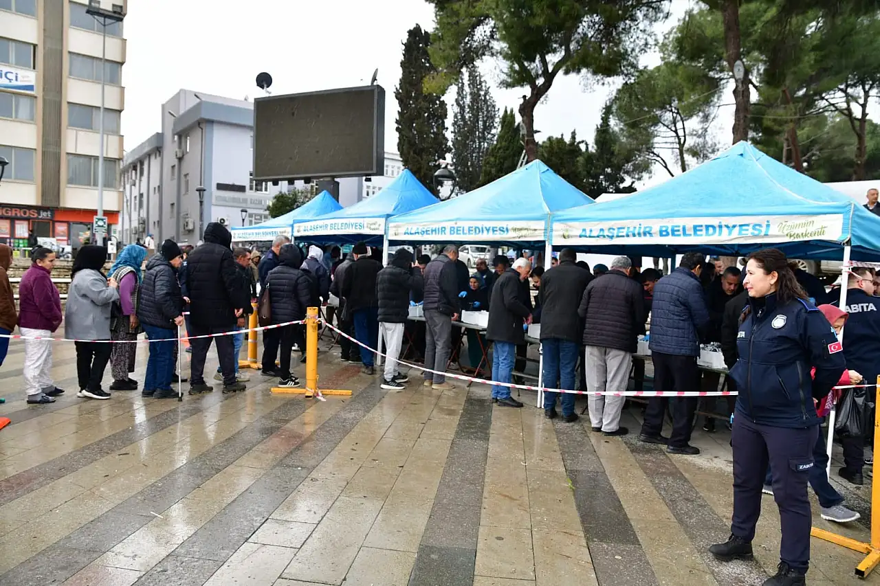 Alaşehir Belediyesi'nin ücretsiz dağıttığı 8 ton hamsi, Cumhuriyet ve Demokrasi Meydanı'nda kısa sürede tükendi, vatandaşlar yağmura rağmen uzun kuyruklar oluşturdu.