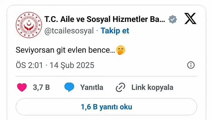 Aile ve Sosyal Hizmetler Bakanlığı, Sevgililer Günü dolayısıyla sosyal medya kanalından bir paylaşım yaptı. Bakanlığın hesabından yapılan gönderide 'Seviyorsan git evlen bence' ifadesine yer verildi. Paylaşımın altına da, Aile Gençlik Fonu'nun linki yorum olarak bırakıldı.