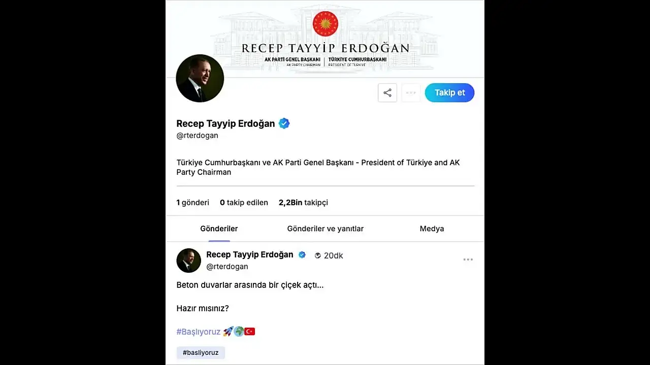 Cumhurbaşkanı Erdoğan, NSosyal üzerinden yaptığı ilk paylaşımda, 1999 yılında yayımlanan şiir albümünde seslendirdiği Erdem Bayazıt’a ait “Birazdan Gün Doğacak” şiirinden "Beton duvarlar arasında bir çiçek açtı" dizesine yer verdi. Erdoğan paylaşımına “Hazır mısınız?” ifadesini eklerken, “#Başlıyoruz” etiketiyle birlikte Türk bayrağı ????????, dünya ???? ve roket ???? emojilerine de yer verdi.