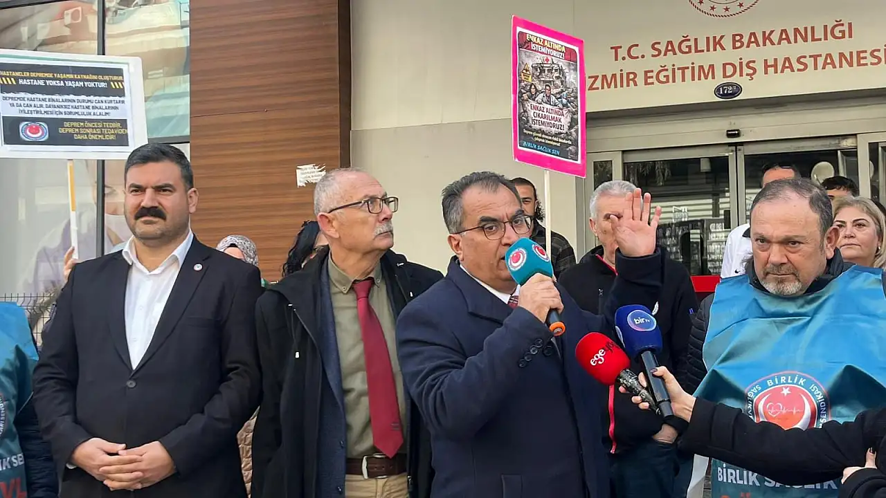 Birlik Sağlık Sen Genel Başkanı Ahmet Doğruyol, İzmir Eğitim Diş Hastanesi önünde yaptığı basın açıklamasında depreme dayanıksız sağlık kurumlarının hem çalışanların hem de hastaların hayatını tehlikeye attığını söyledi. Doğruyol, 'Acil boşaltılma kararı olan hastanelerde çalışmak istemiyoruz' dedi.
