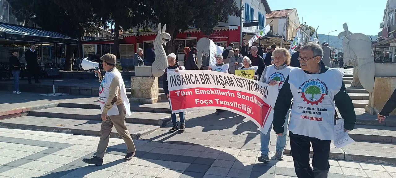İzmir Foça'da bir araya gelen emekliler, hükümetin ekonomi politikalarını protesto etti. Tüm Emeklilerin Sendikası Foça Şube Yöneticisi Tuğrul Çölmekçi, 'Bahane çok ama çözüm yok. Kaynak yok diyenler faizcilere milyarlar buluyor' dedi.