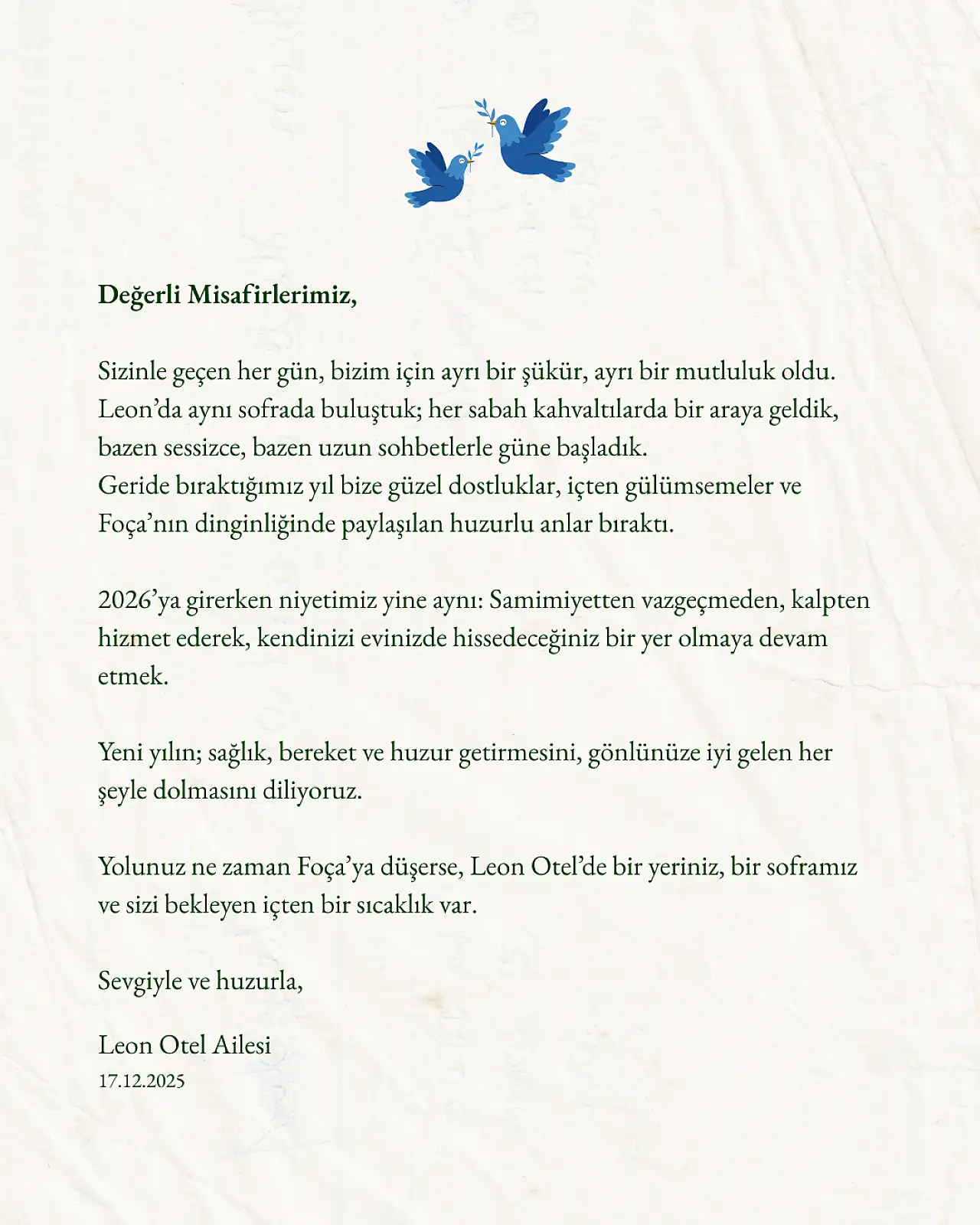 Leon Otel’den gelen bu mesaj, bir işletmenin yeni yıl kutlamasının ötesinde; vefa duygusunu, toprağa saygıyı ve aile bağlarının gücünü yansıtan özel bir anlatı olarak öne çıktı. Foça’nın sakin ve sıcak atmosferinde şekillenen bu mesaj, misafirlerine hem bir sofra hem de güçlü bir aidiyet hissi sunmayı hedefliyor.