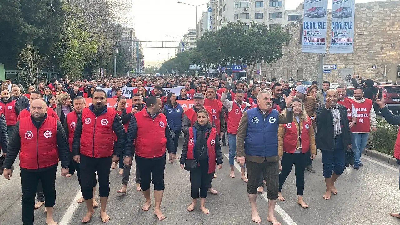 İzmir Büyükşehir Belediyesi’ne bağlı İZENERJİ, İZELMAN, İZTEK ve Egeşehir şirketlerinde yaşanan ödeme krizi büyürken, DİSK Genel-İş üyesi binlerce işçi bugün iş bıraktı. Üç aydır ödenmeyen sosyal haklar, fazla mesai alacakları ve maaş kesintilerine tepki gösteren işçiler, sabah saatlerinde sendika binası önünde toplanarak çıplak ayakla Kültürpark Basmane Kapısı’na yürüdü.