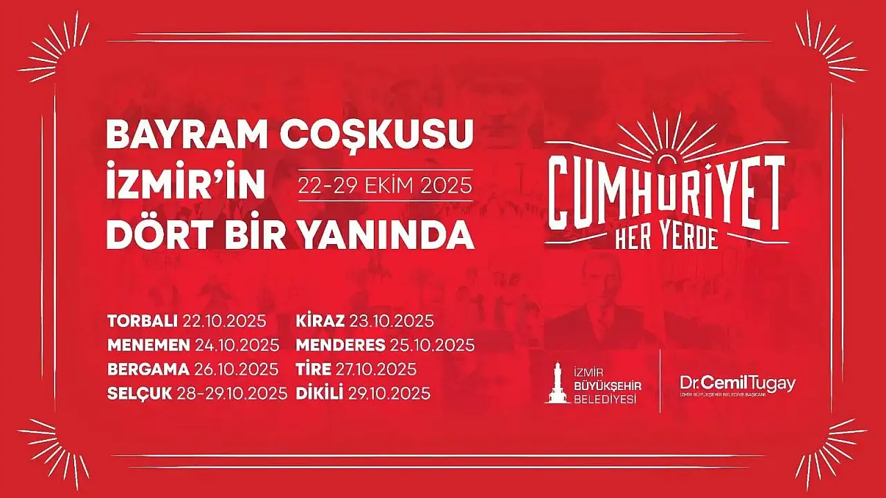 “Cumhuriyet Her Yerde” programı, 23 Ekim’de Kiraz Yeni Mahalle, 24 Ekim’de Menemen Gazi Mustafa Kemal Mahallesi, 25 Ekim’de Menderes Şehit Astsubay Ömer Halis Demir Parkı, 26 Ekim’de Bergama Ayaskent Mahallesi, 27 Ekim’de Tire Merkez Gölet, 28 Ekim’de Selçuk Belevi Mahallesi’nde gerçekleştirilecek. 29 Ekim’de Selçuk Zeytinköy Mahallesi’nde bando gösterisi yapılacak. Akşam saatlerinde Selçuk Merkez İstasyon Meydanı’nda kortej yürüyüşü, konserler ve çocuk etkinlikleri düzenlenecek. Aynı gün Dikili’de yapılacak konserler kutlamaların doruk noktası olacak.