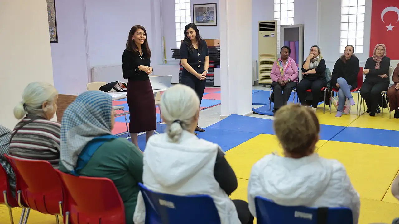 Etkinliklerin ilk atölyesi, Gültepe Semt Merkezi’nde yapıldı. Kurslara devam eden kadınların katılımıyla düzenlenen “Kadına Yönelik Şiddetle Mücadele ve Güvenlik Planı Oluşturma” atölyesinde, Konak Belediyesi Kadın ve Aile Hizmetleri Müdürlüğü’ne bağlı Eşitlik ve Kadın Danışma Birimi’nden Sosyal Hizmet Uzmanı Esra Çakıçı Akgün ve Uzman Halk Sağlığı Hemşiresi Aysun Çobadak Çalt, interaktif sunumlar yaparak katılımcılara farkındalık kazandırdı