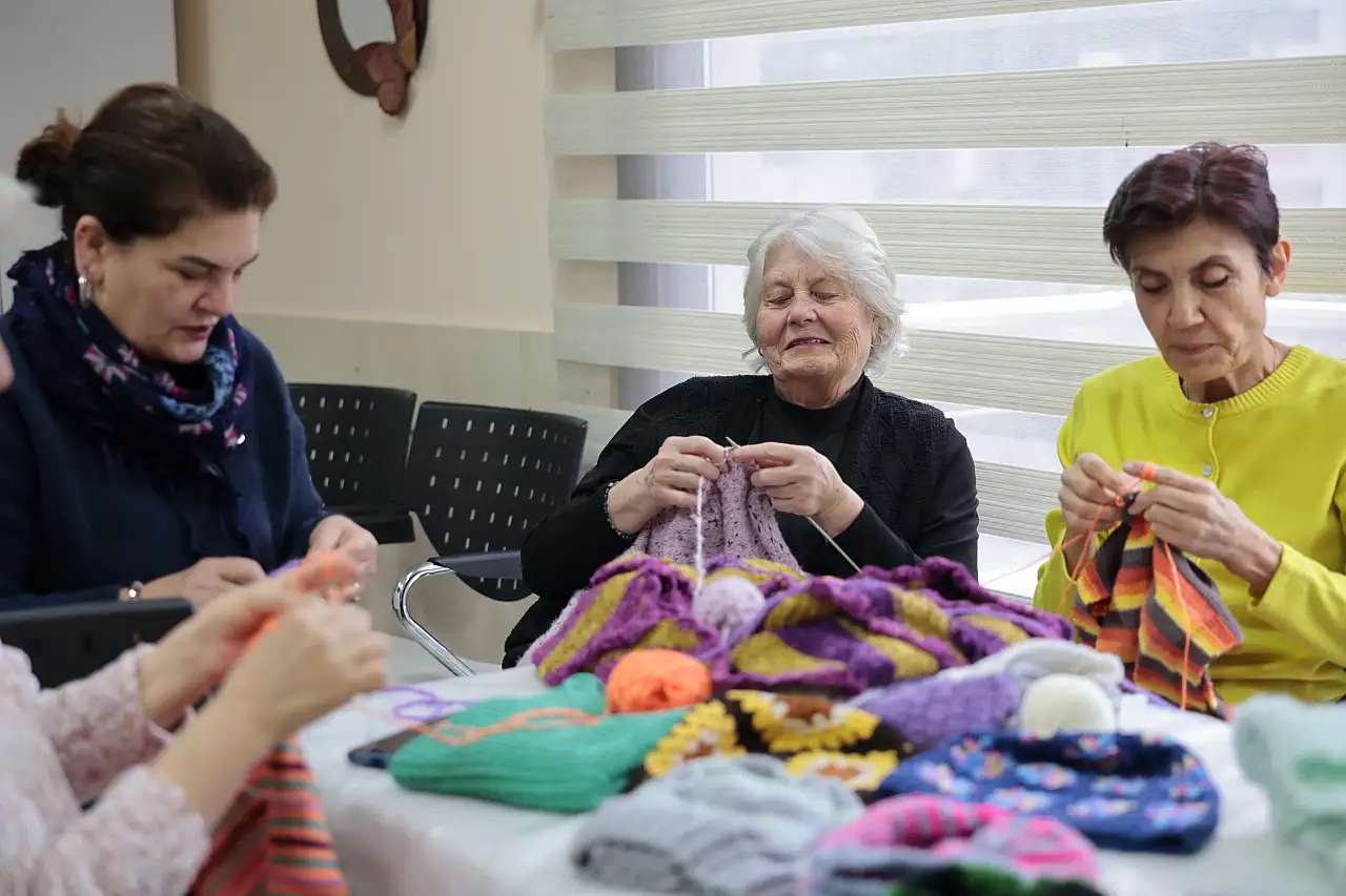Konak Belediyesi İleri Yaş Sağlıklı Yaşam Merkezi'nde örgü ören kursiyerler, el emeği ürünleri köy okulları ve hastanelerin onkoloji servislerinde tedavi gören çocuklara ulaştırarak yüzleri güldürüyor.