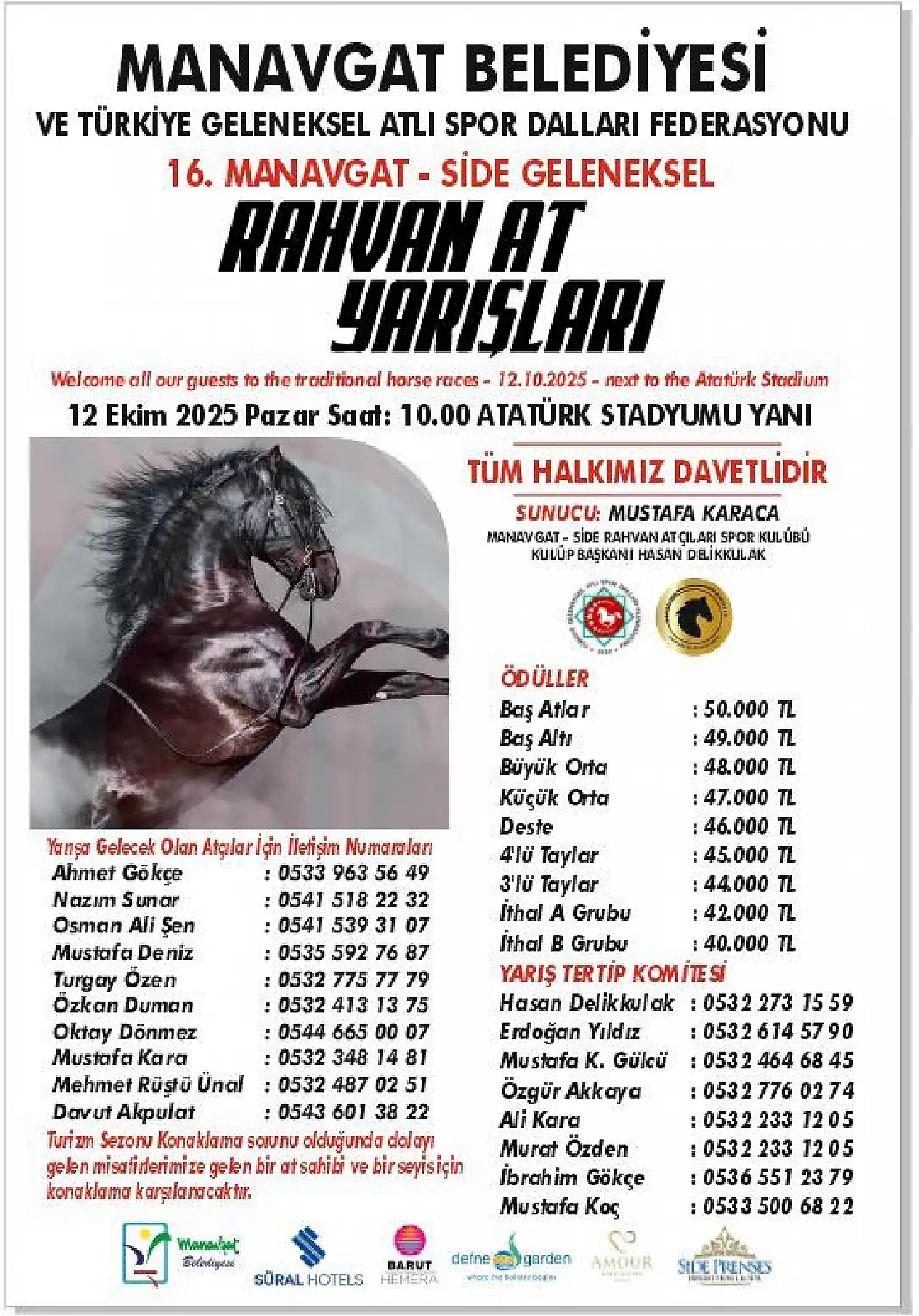 Etkinliğin sunuculuğunu Mustafa Karaca, organizasyon ev sahipliğini ise Manavgat-Side Rahvan Atlı Spor Kulübü Başkanı Hasan Delikulak üstlenecek. Yarış boyunca yapılacak canlı anonslar ve açıklamalar, izleyenlerin heyecanını daha da artıracak.