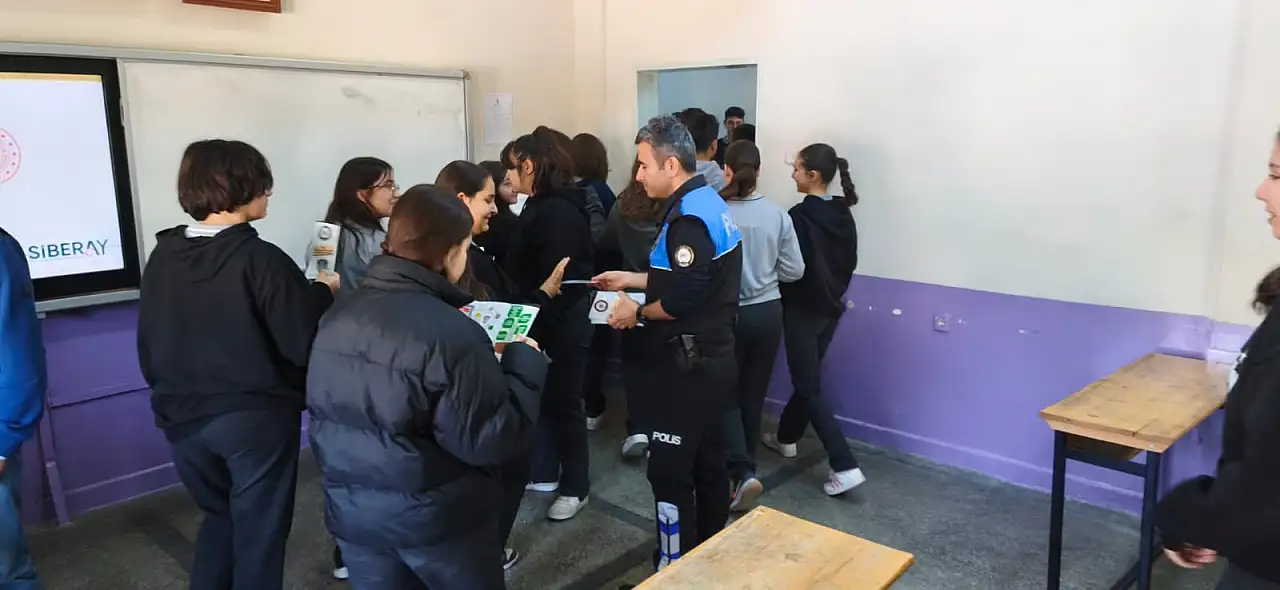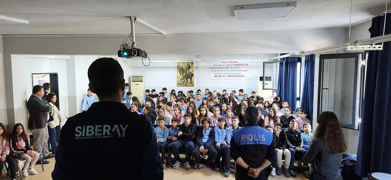 İzmir Siber Suçlarla Mücadele Şube Müdürlüğünde görevli eğitici personel tarafından verilen SİBERAY eğitiminde öğrencilere internet ortamında karşılaşılabilecek riskler, güvenli internet kullanımı ve siber zorbalıkla mücadele konularında önemli bilgiler aktarıldı.
