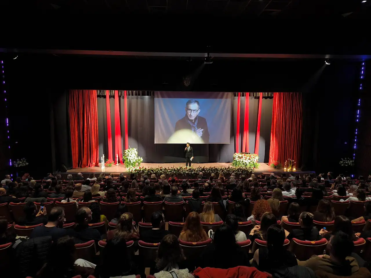 Sahne Tozu Tiyatrosu'nda düzenlenen etkinlikte, yapay zekâ ile sahneye yansıtılan Haldun Dormen'in görüntüsü ve sesi izleyicilere unutulmaz anlar yaşattı