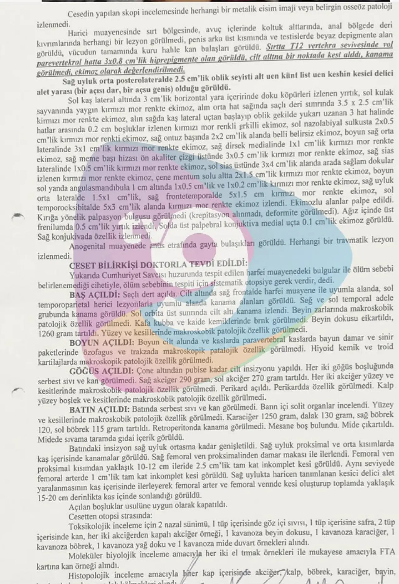 Adli Tıp raporunda, Mersinli’nin ellerinde naylon koruma bulunduğu, sırt kısmında ise elektrod pedleri tespit edildiği belirtildi. Vücudun farklı bölgelerinde ek bir kesici ya da darp izine rastlanmadığı, genelinde ise kan bulaşları olduğu kaydedildi.